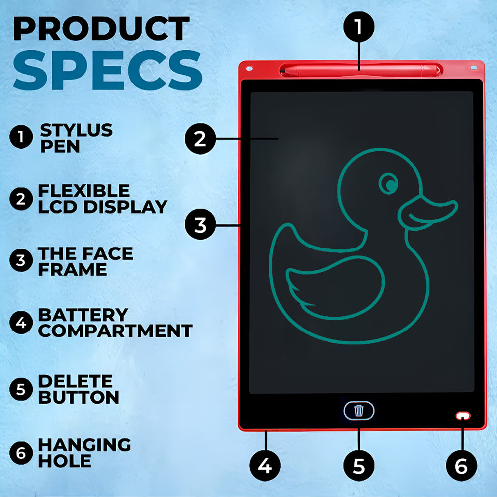 The 12" LCD Writing Tablet is a reusable, eco-friendly digital notepad ideal for writing, drawing, and note-taking. With a one-touch erase function and a lock feature, it's perfect for both kids and adults. Lightweight, durable, and easy on the eyes, it’s a great alternative to traditional paper.